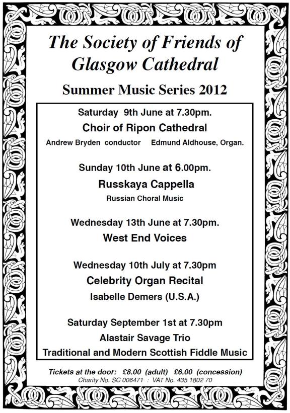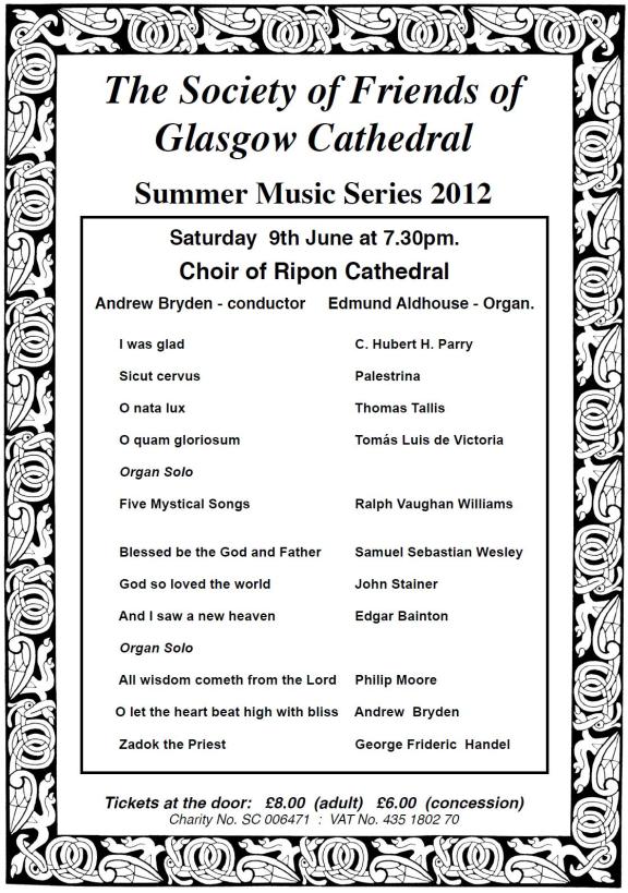 On Saturday June 9th, The Choir and Organists of Ripon Cathedral are giving a concert in Glasgow Cathedral at 7.30pm.