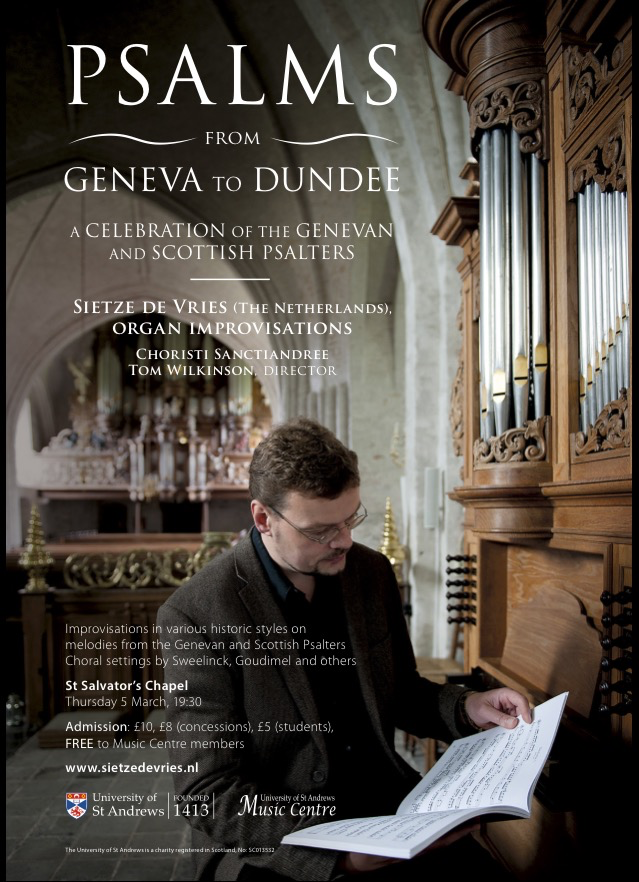 On Thursday 5 March at 7.30pm, Sietze de Vries will make a rare UK appearance at St Salvator’s Chapel in St Andrews. Due to his particular expertise regarding the Genevan Psalter, which remains the backbone of Dutch Reformed Hymnody, we have asked him to perform an improvisation concert on melodies from both this and the Scottish Psalter of 1615/1635 (including the melodies ‘Dundee’, ‘Old 124th’, ‘Martyrs’ and ‘London New’). The University’s elite chamber choir ‘Choristi Sanctiandree’, under the direction of Tom Wilkinson, will also provide choral settings of the Genevan melodies including music by Sweelinck and Goudimel.