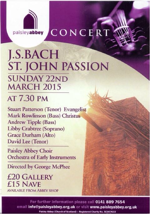The performance of Bach’s masterpiece, the St. John Passion, will take place on Sunday 22nd March at 7.30 pm. It will be noteworthy for several reasons. Firstly, the Abbey Choir will be joined by several former choristers as soloists. The Evangelist will be Stuart Patterson who is now enjoying a successful career, mainly in opera in France and Switzerland. David Lee, who will sing the tenor arias, is a former boy chorister who has graduated (First Class honours in music) from Oxford University and who is now studying for a PhD at Glasgow University. He also sings extensively with various top British and continental chamber choirs. Andrew Tipple (Bass) was a recent choral scholar with us after his student days in the choir at King’s College Cambridge.