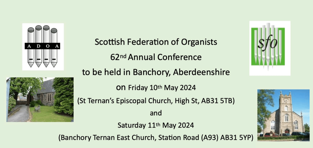 Aberdeen and District Organists’ Society looks forward to welcoming you to the 62nd SFO Conference to be held in Banchory.