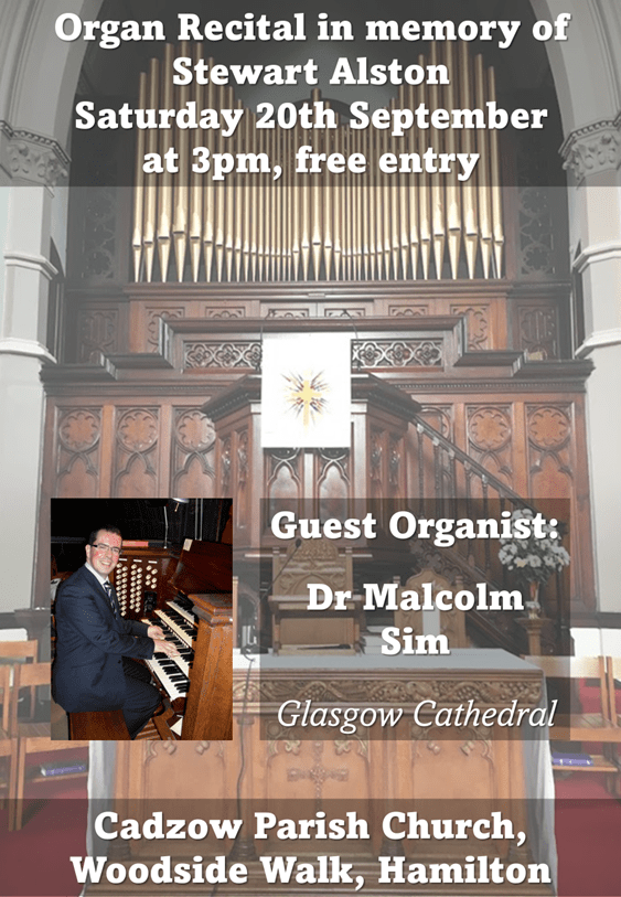 The Recital is in the superb Cadzow Church, and we are delighted to welcome Dr Malcolm Sim (of Glasgow Cathedral) as our guest organist